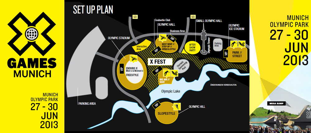 Спортивная жизнь Мюнхена пополнится в этом году абсолютно новым уникальным событием, а именно международными экстремальными играми X Games Munich, которые пройдут в Олимпийском парке с 27 по 30 июня. Данное событие также проводится в Аспене (США), Тине (Франция), Фос-ду-Игуасу (Бразилия), Барселоне и Лос-Анджелесе. Баварская столица удостоилась особой чести, именно здесь впервые в истории X Games пройдут соревнования по новой дисциплине – маунтинбайк слоупстайл, что представляет собой выполнение серии акробатических прыжков на трамплинах, пирамидах, перилах и т.д. на протяжении всей дистанции